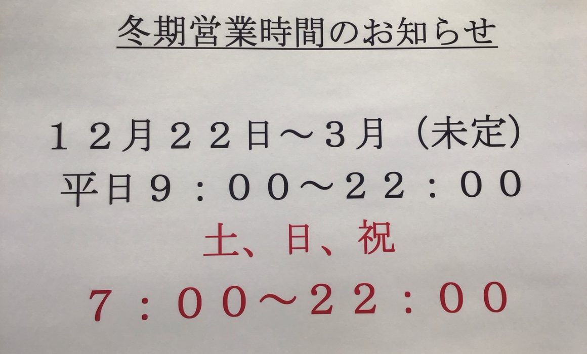 冬期営業時間のお知らせ 12月22日から冬期営業時間へ変更となっております。 平 日:9時から22時間まで土日祝:7時から22時間まで ご理解の程よろしくお願いいたします。 お客様のご来店心よりお待ちしております。... 2025年12月18日