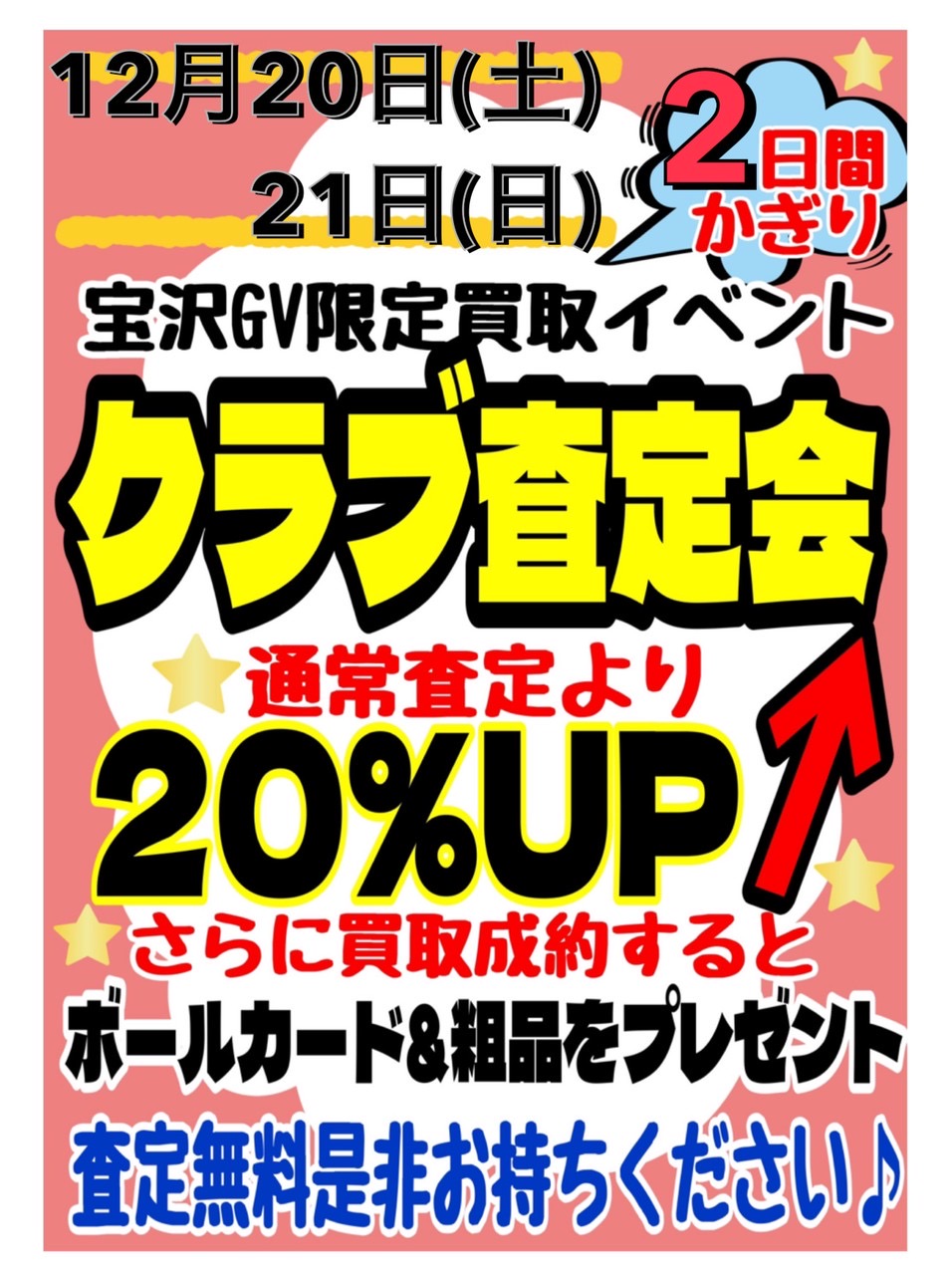 2025年12月19日 クラブ査定会開催!【12/20(土)〜21(日)】 12月20日・21日の2日間限定! 大人気イベントクラブ査定会を開催いたします。 査定額が通常査定より20%UP!さらに買取成約すると、、、ボールカード&オリジナルの粗品をプレゼント!! 使わないクラブをお持ちのお客様やお買い替えを考えているお客様、是非当店へお持ちください。 是非この機会にお誘い合わせの上クラブをお持ちになってご来店下さい。 皆さま方のご来店心よりお待ちしております... カテゴリー: お知らせ , イベント , ニュース| タグ: 詳細を見る